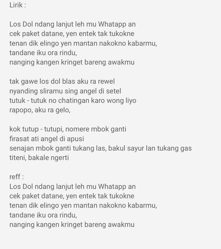 Belum ada info detil tentang single ini. Berikut cuplikan syair nyanyian teks lagunya los dol ndang lanjut lehmu whatapp-an cek paket datane yen entek tak tukokne tenan dik elingo yen mantan nakokno kabarmu tandane iku ora rindu nanging kangen kringet bareng awakmu tak. Ndang lanjut leh mu Whatsapp an.